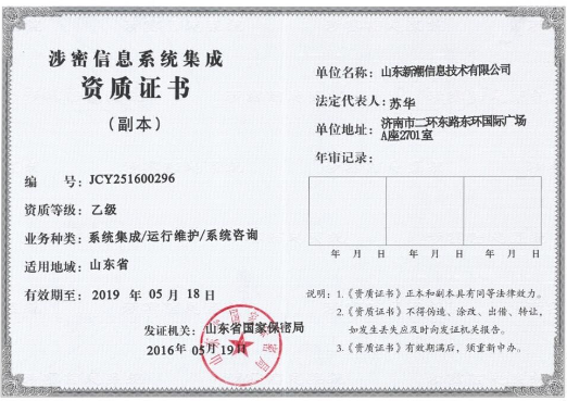 2016年5月,我公司獲得山東省保密局頒發(fā)的涉密信息信息系統(tǒng)集成資質(zhì),業(yè)務(wù)范圍包括:系統(tǒng)集成、運行維護(hù)、系統(tǒng)咨詢,此證書成為我公司發(fā)展的又一里程碑。
